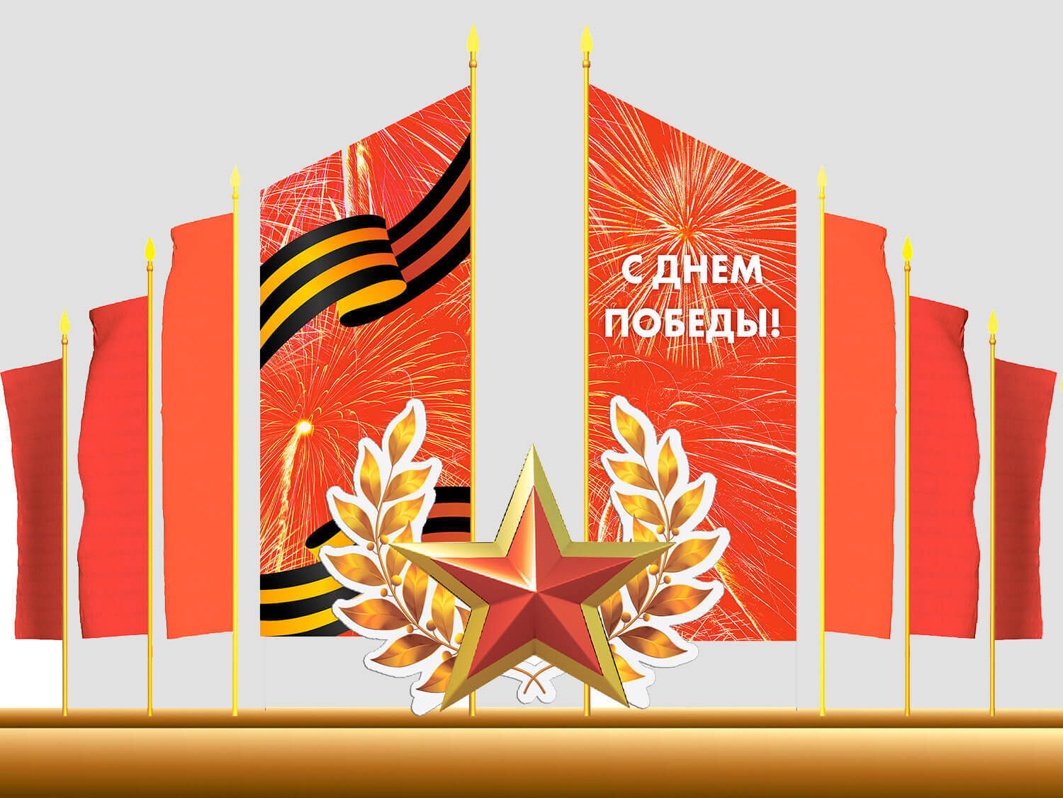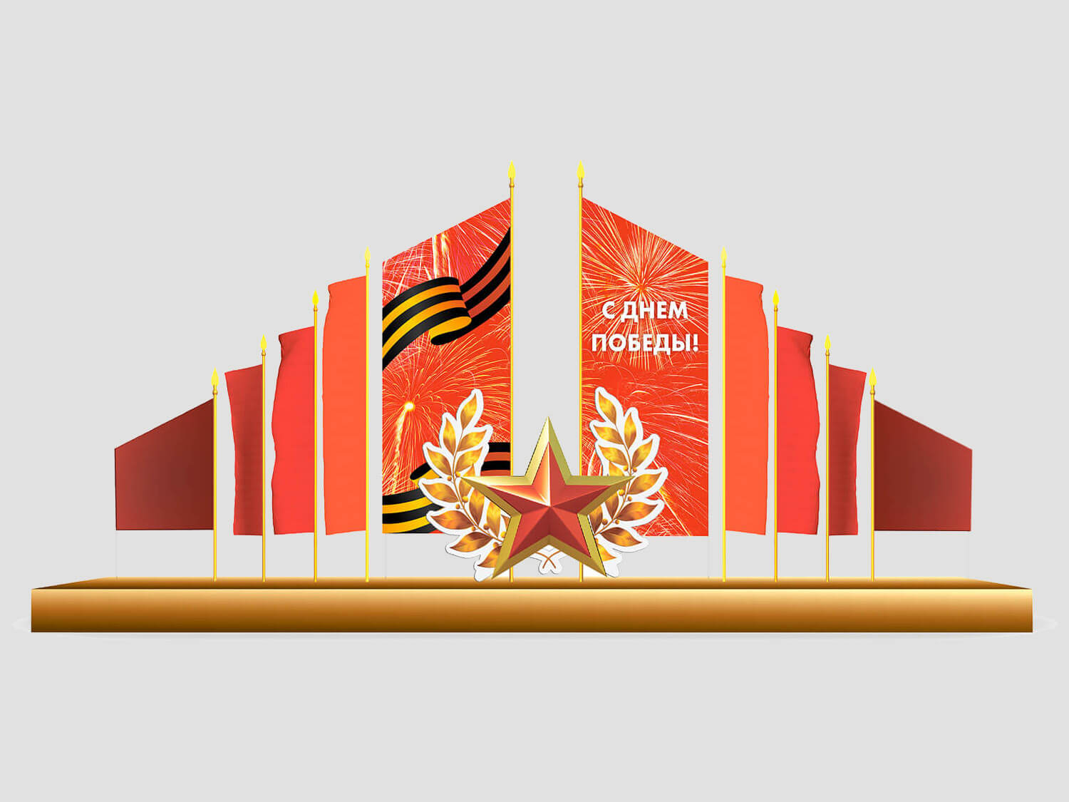 A large-scale flag composition enhanced with decorative elements. Ideal for city squares or festive locations and can be complemented with consoles and garlands in a matching style.