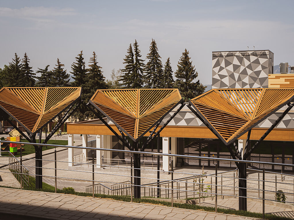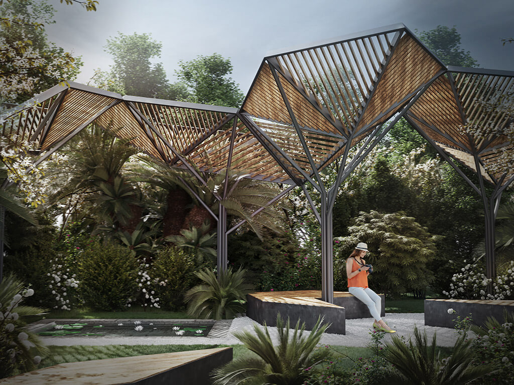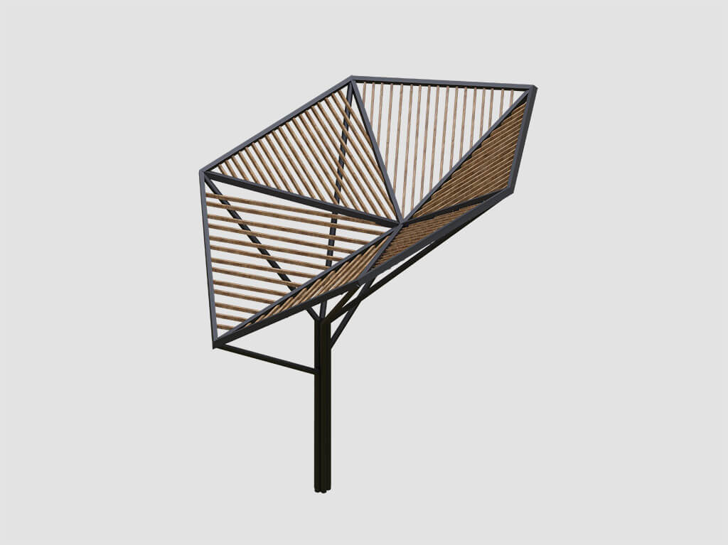 The Fern canopy is a popular structure that has already adorned many cities in Russia. The canopy resembles fantastic trees that protect from direct sunlight and decorate the space. It is made of a metal frame and wooden elements and can be complemented with benches or small podiums, such as those from the Tangram collection.