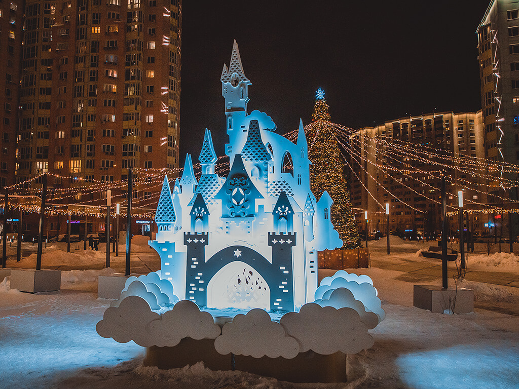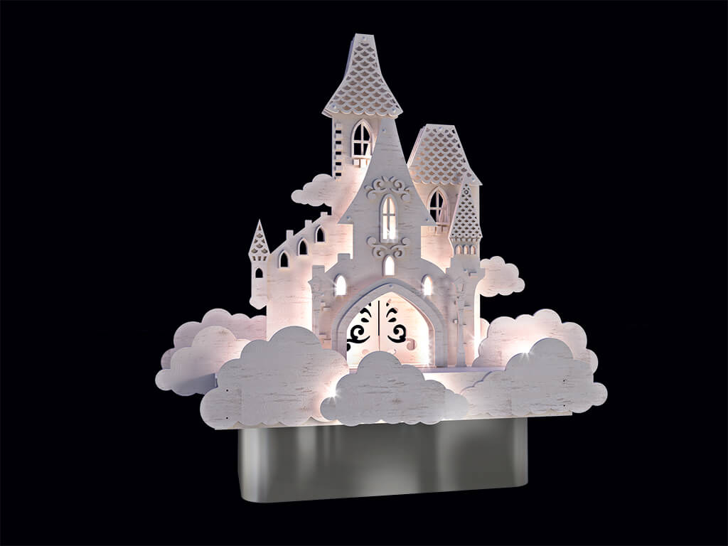 Bring a fairy tale to life with this enchanting castle installation with 3D elements, featured in over 10 cities. Designed with intricate details and soft lighting, the castle appears to float on clouds, adding a magical touch to any space. Available in three sizes, with the tallest one measuring impressive 3.7 meters, and the two smaller ones 2.6 and 1.9 m.