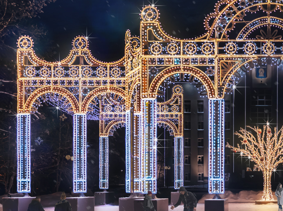 The glowing vaults of golden arches have decorated many cities in Russia. They look truly impressive: ordinary urban locations become transformed and begin to resemble a fairytale space, as if a magical castle has appeared. The arches can be complemented with any art objects, such as a sparkling tree or animal figures.