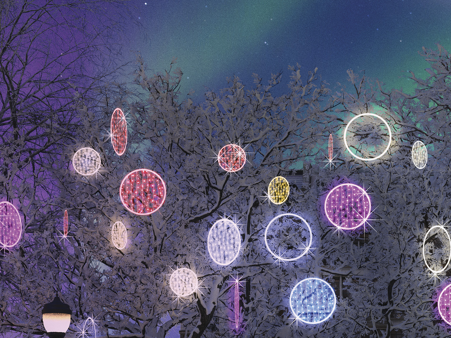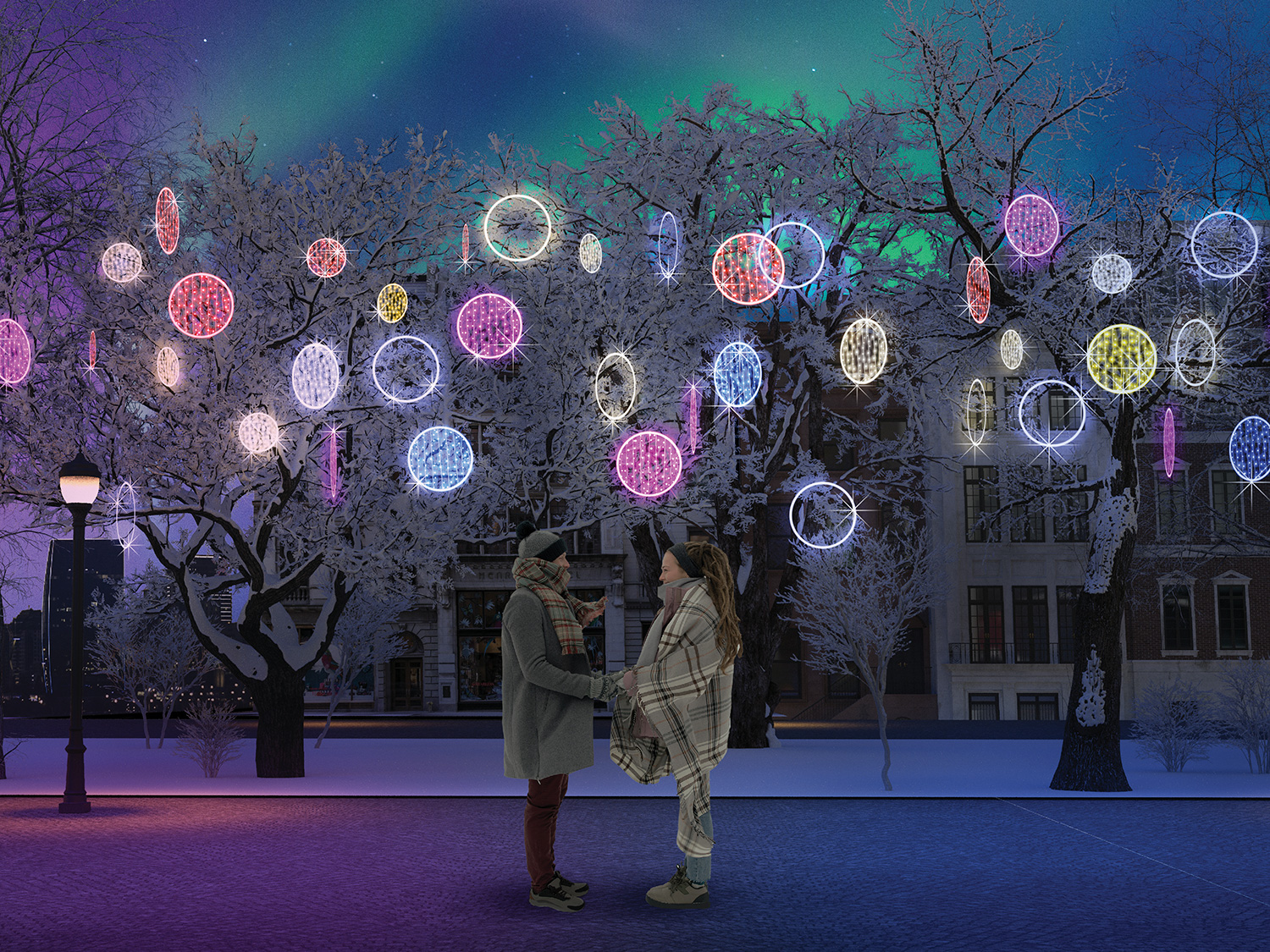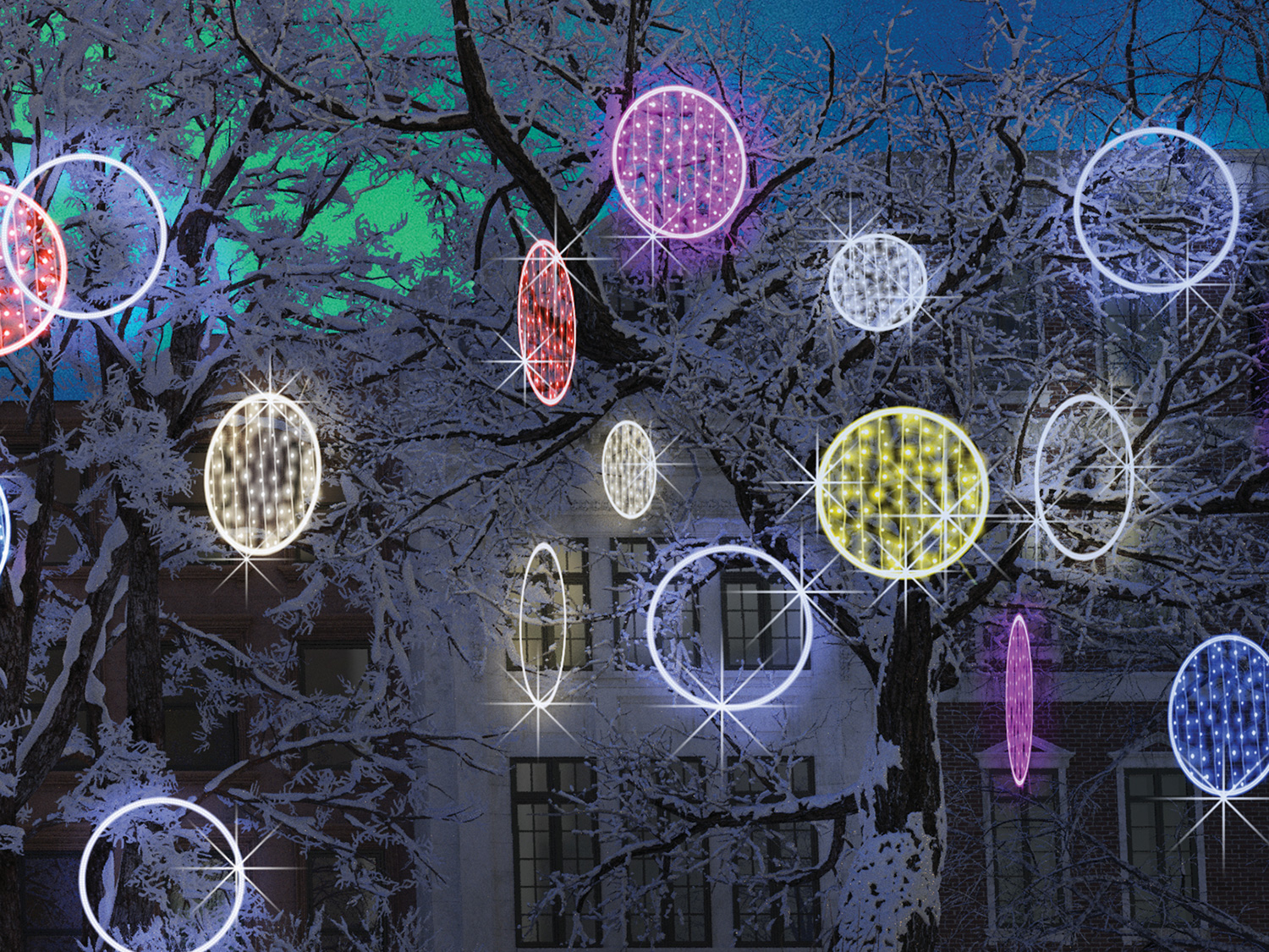 Tree decoration projects are usually developed and calculated individually. The appearance of the decoration depends on the features of each specific location and the client’s objectives. Colorful circles are great for supporting design concepts that use bright neon colors, as well as for creating the necessary light accents.