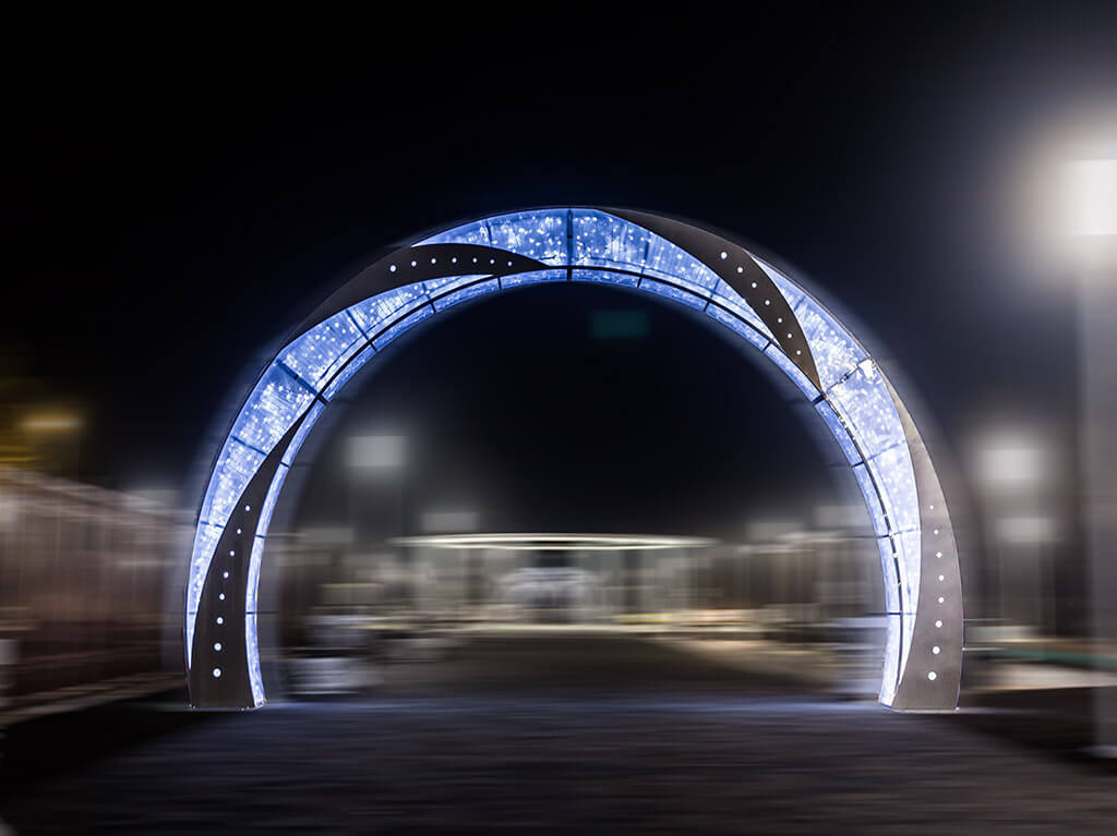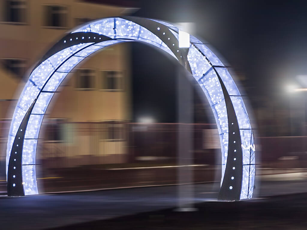 Arch 9342 will serve as a striking entryway to a park or square, and can be used as a standalone structure or as part of a consistent composition. The arch is complemented with internal lighting and looks impressive both during the daytime and in the evening. The structure is made from high-quality materials and will serve the city for many seasons.