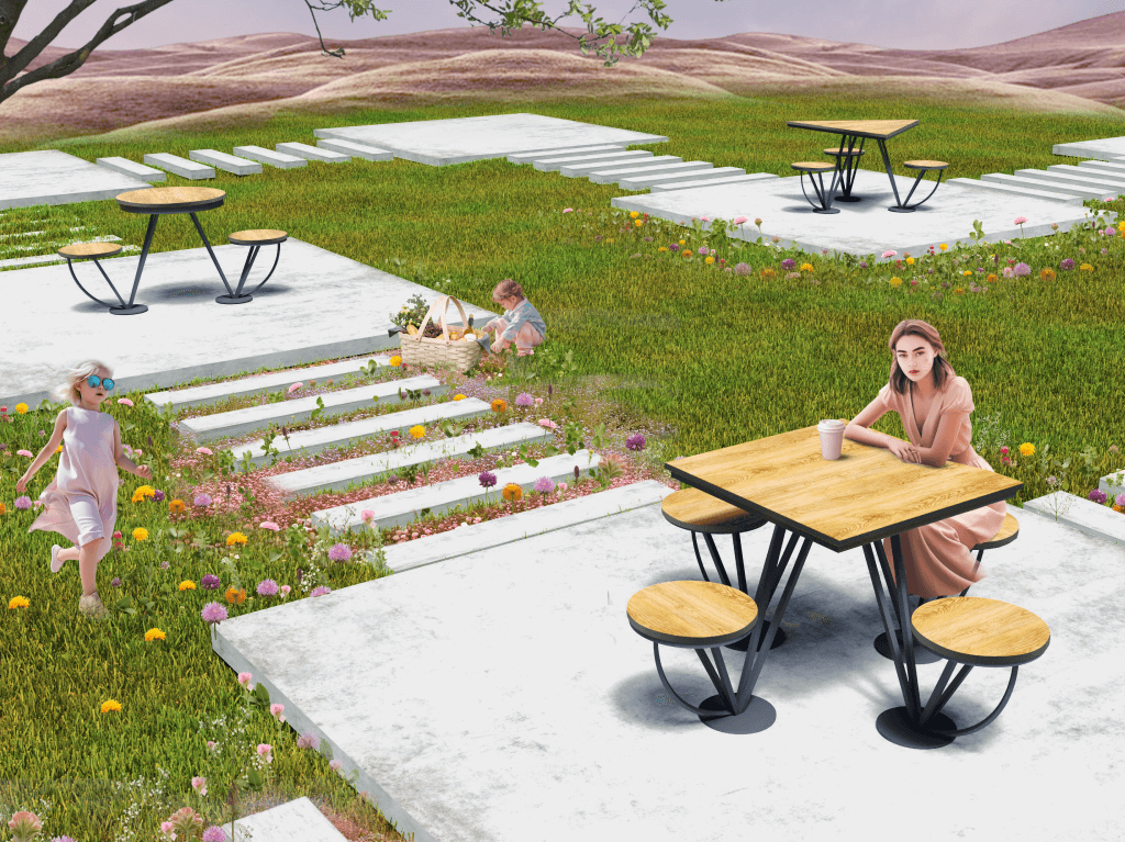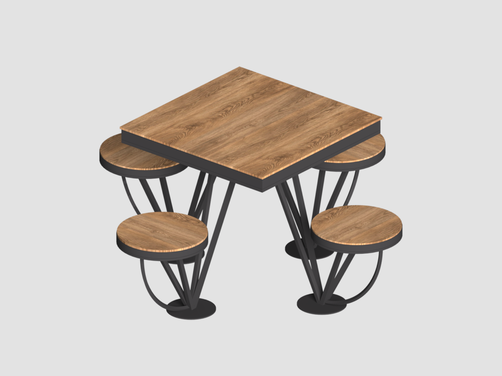 Available in round, triangular, and square shapes, this table adds diversity to your landscaping design. Its standout feature is the illusion of floating seats, a unique element that will catch the eye of passersby.