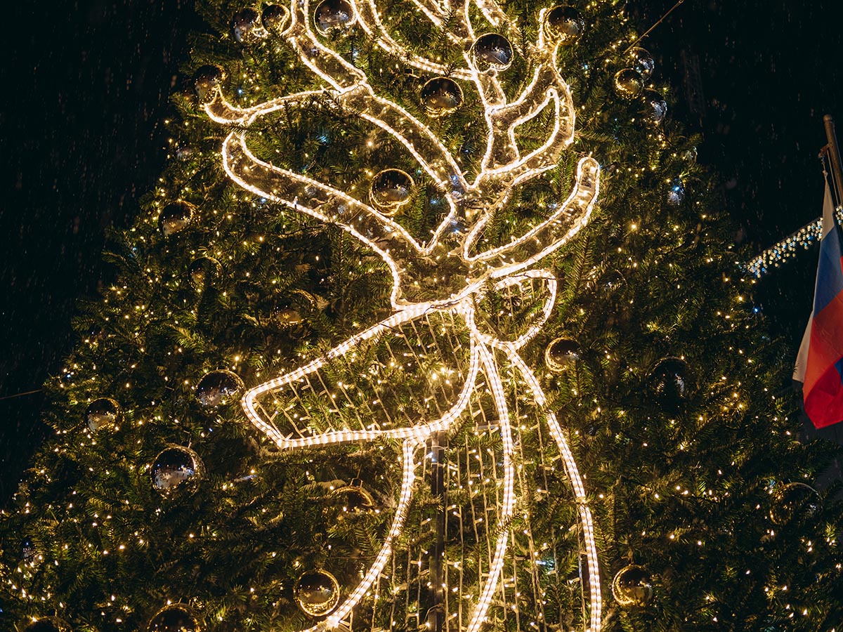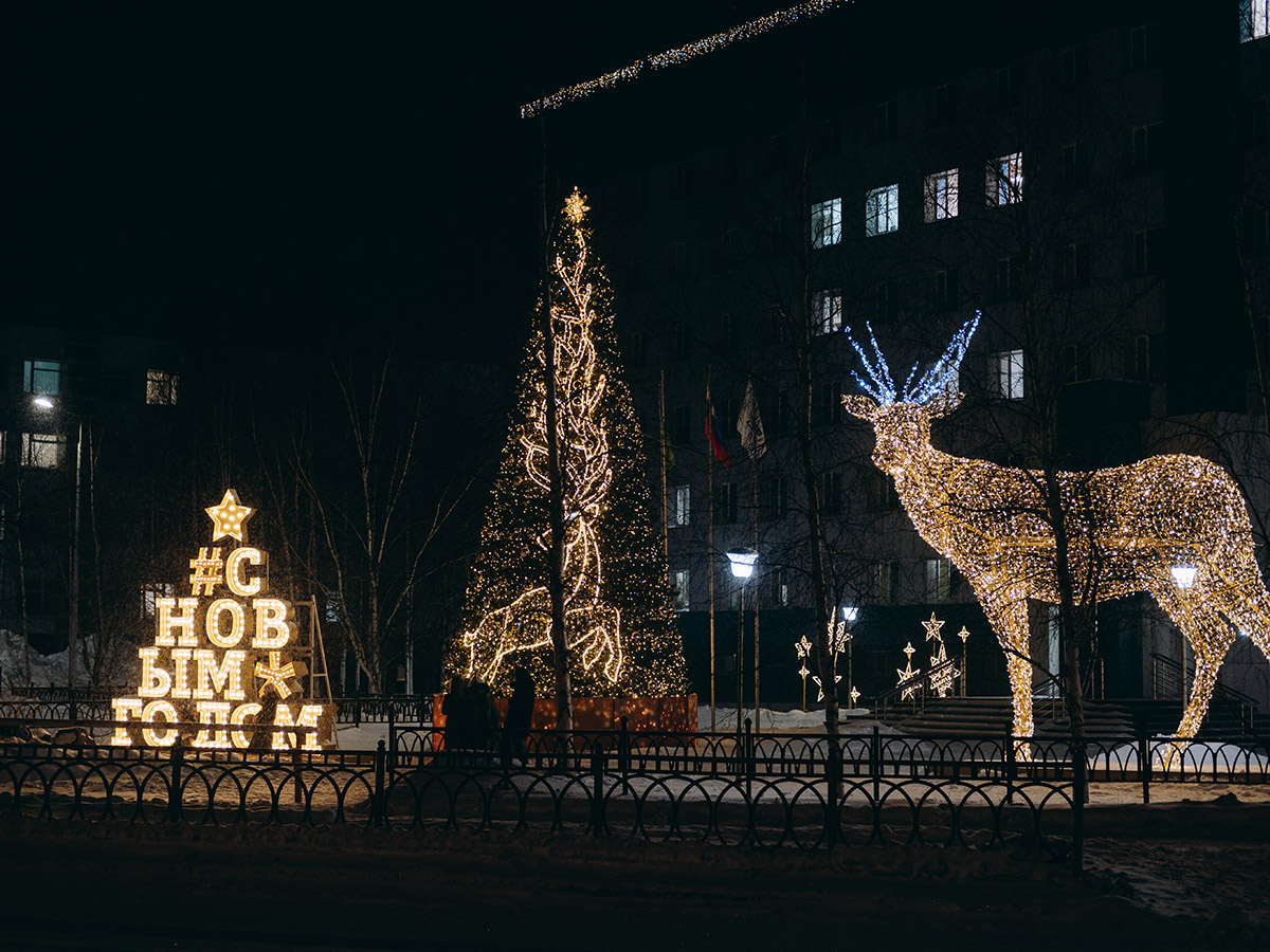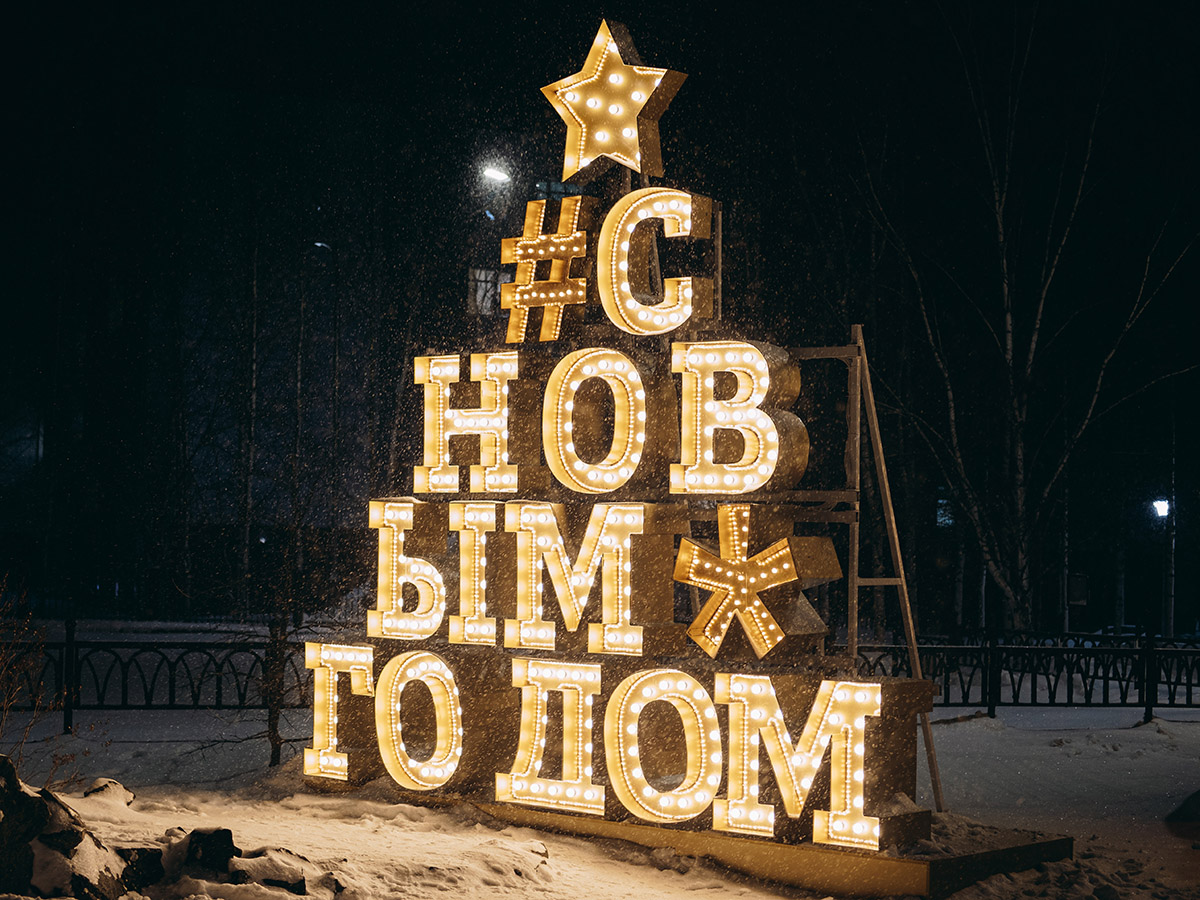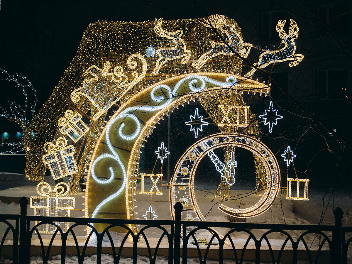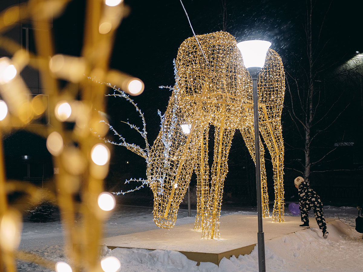 One of our New Year’s decoration projects was compactly placed on a meadow in the industrial part of the city of Nizhnevartovsk. Despite the surrounding factories, children eagerly run every day to the giant animals — the sparkling reindeer, 7.1 meters high. The “Happy New Year” hashtag in the form of a fir tree with retro light bulbs has undoubtedly become a photo zone.