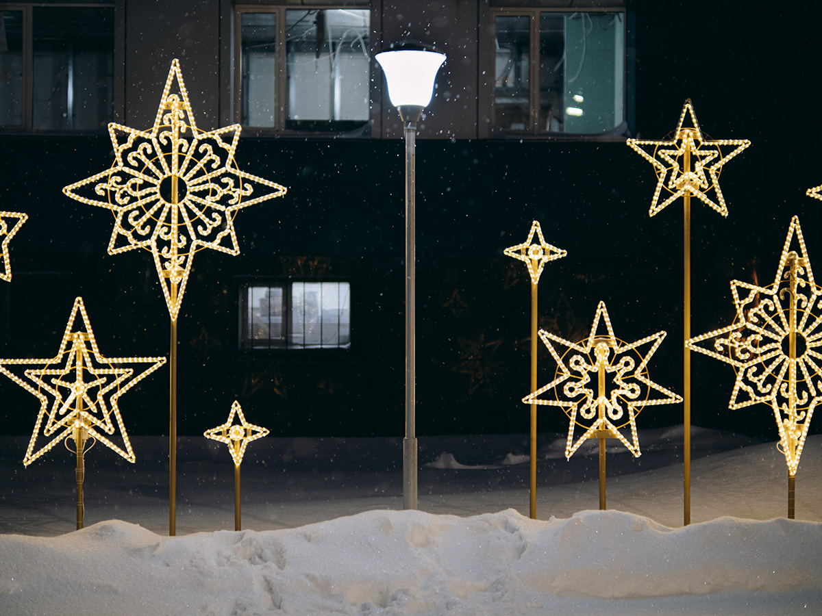 The central piece was a Christmas tree decorated with ornaments and a glowing reindeer with branching antlers. Stars, seemingly descending from the sky, decorate the edge of the building, illuminating the entire meadow with their warm LEDs. Close by, there is a LED strip clock symbolizing a whirlwind, reminding us that time flies, and that the most magical time of the year is approaching.